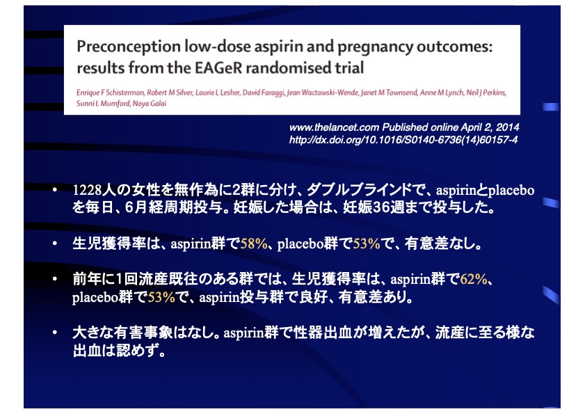 では、実際に低用量アスピリンを飲むと、妊娠には有利なのかということに関して、2014年4月2日に、Lancetという医学雑誌に非常に良い論文が載っています。