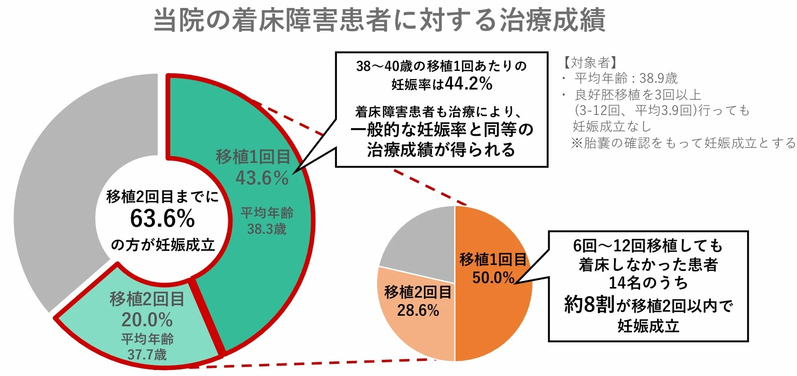 さらに、胚移植を6回以上行っても着床に至らなかった患者14名のうち、当院での検査と治療後には7名(50%)が1回目の移植で妊娠し、4名(28.6%)が2回目の移植で妊娠という成果が得られました。